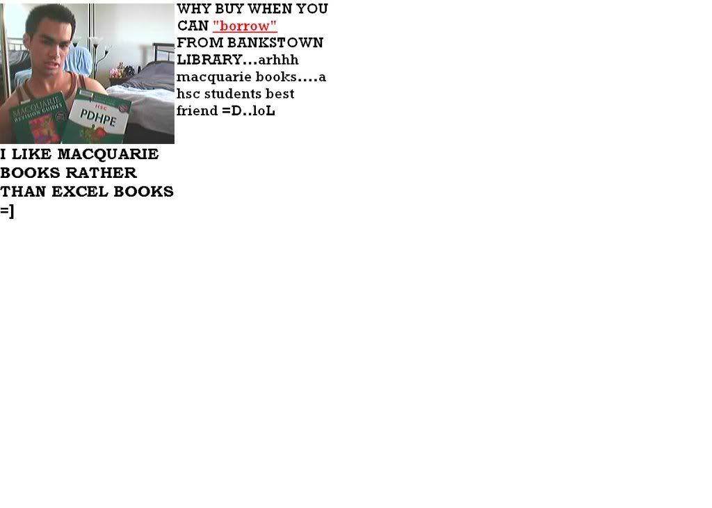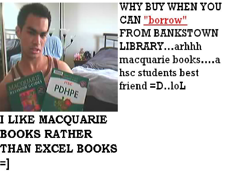 well uhhh I havnt bloged in yonkerbobbies so thought ide drop by hhehehe =D...well todays such freakn mad day to go out....the suns out and its hot....but im stuck at home alone doing nothing...well im studying...im slowly getting there lol...its scary coz the hsc exams are just over a month away...and I havnt even finished all my notes yet...thank god for macquarie text books which have topics summaries really good instead of having fat textbooks which has a lot of shit yu dont need =].